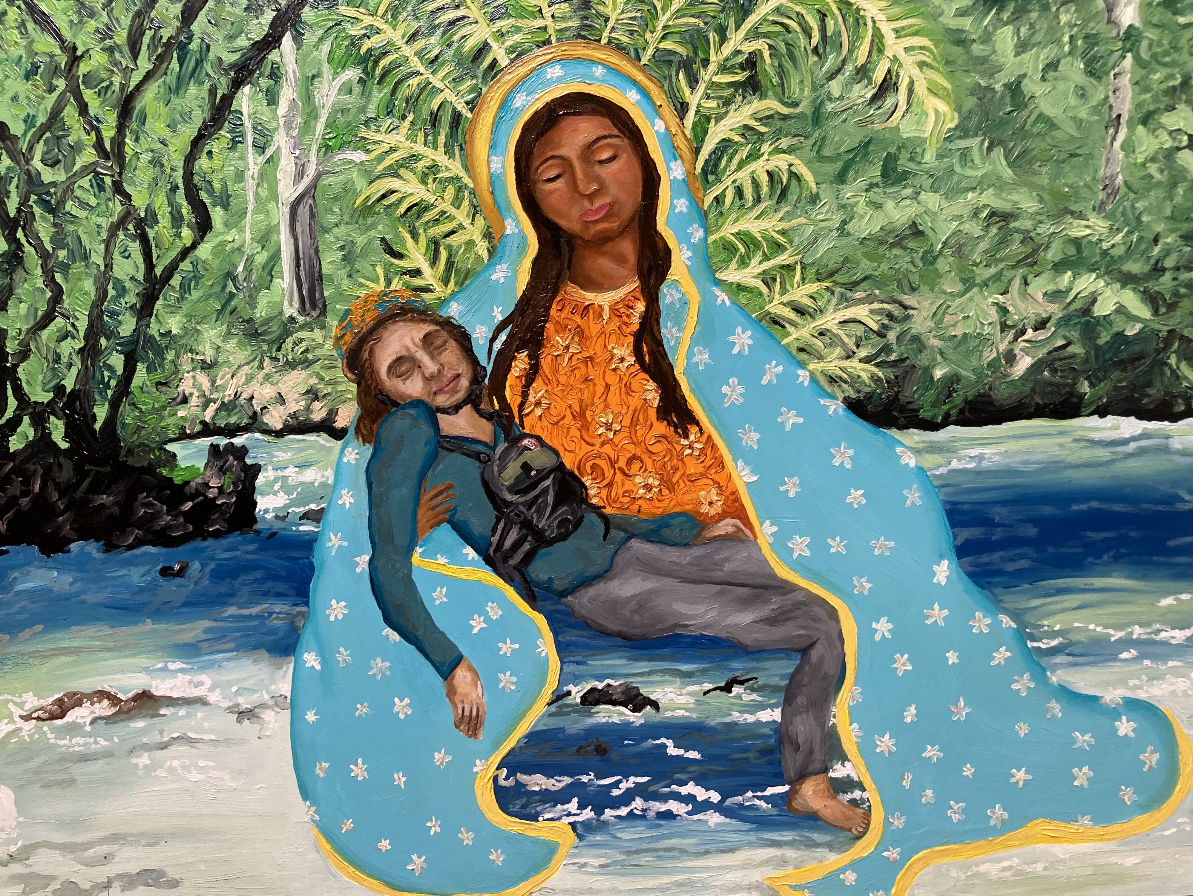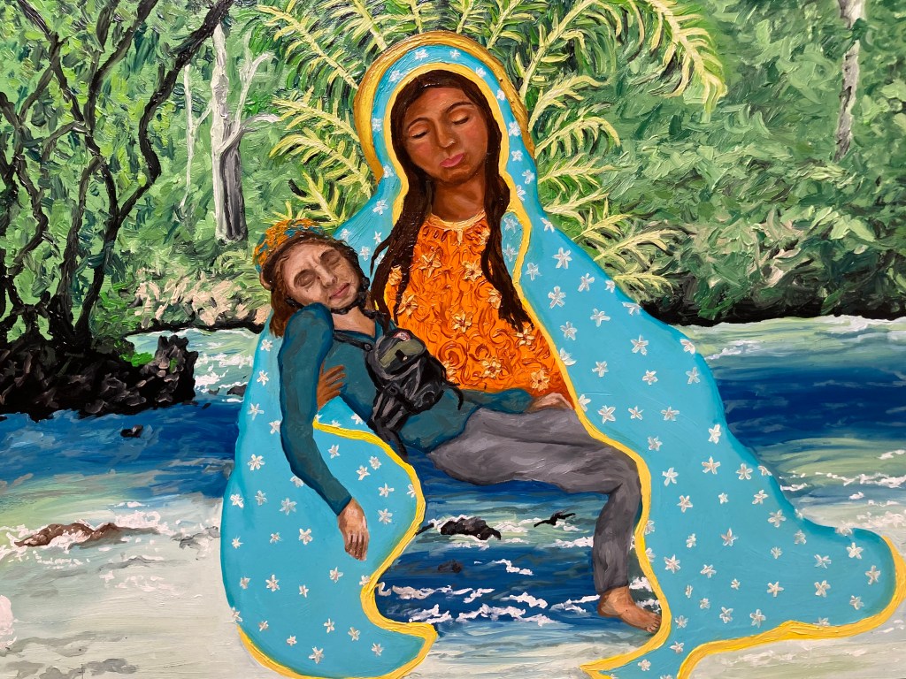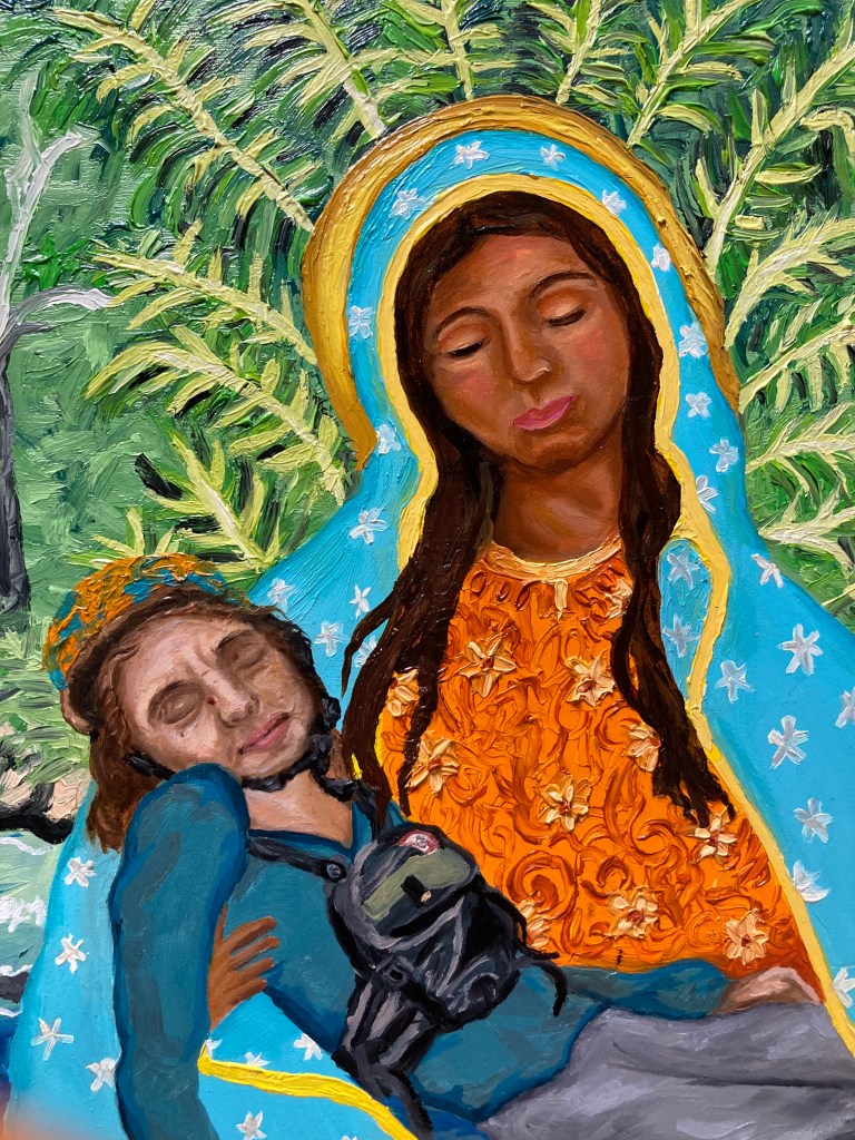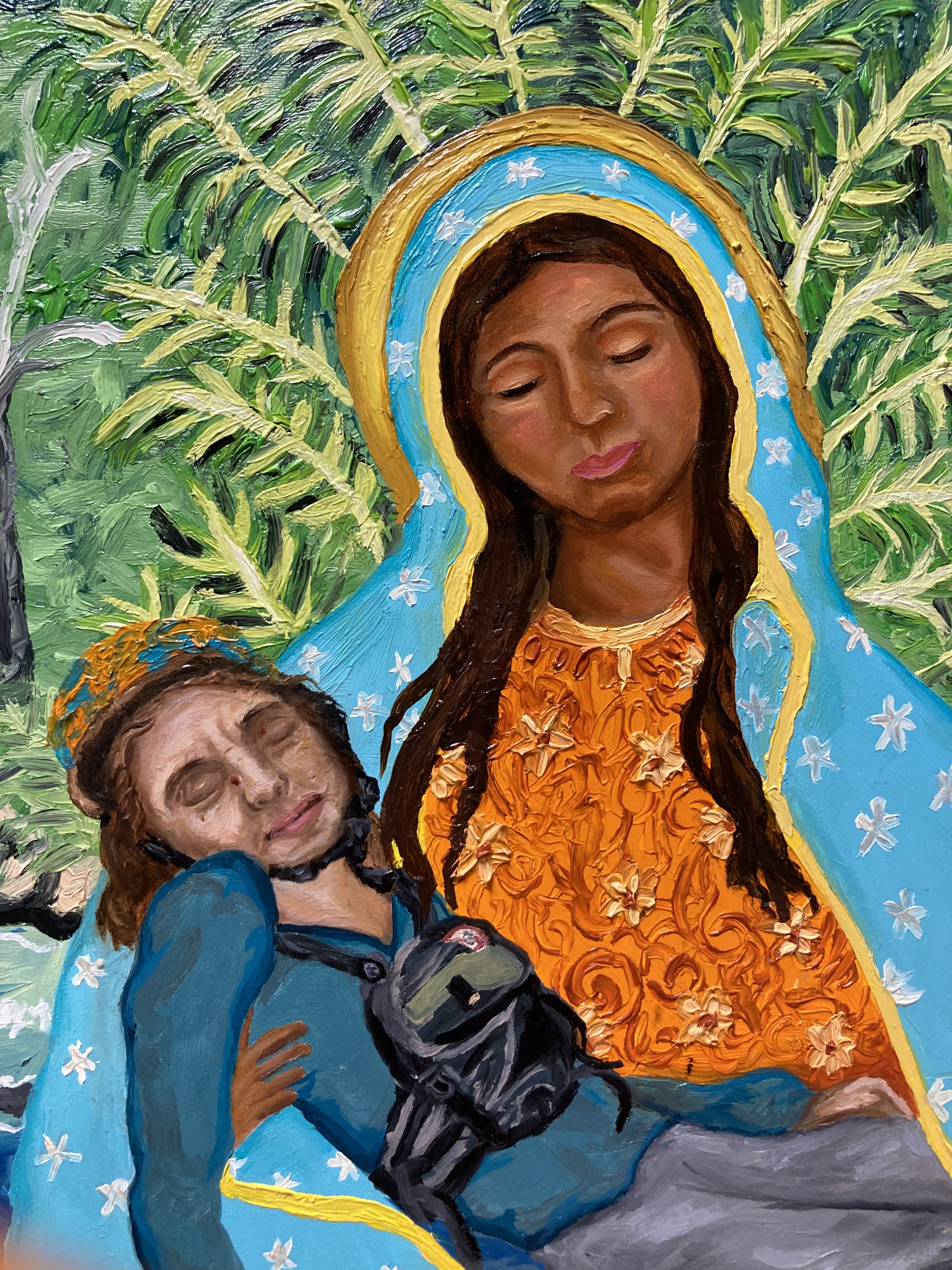 Xhiv is true to her unique style while skillfully depicting her brother at rest in Mary’s arms. I’m undone at the beauty of it.