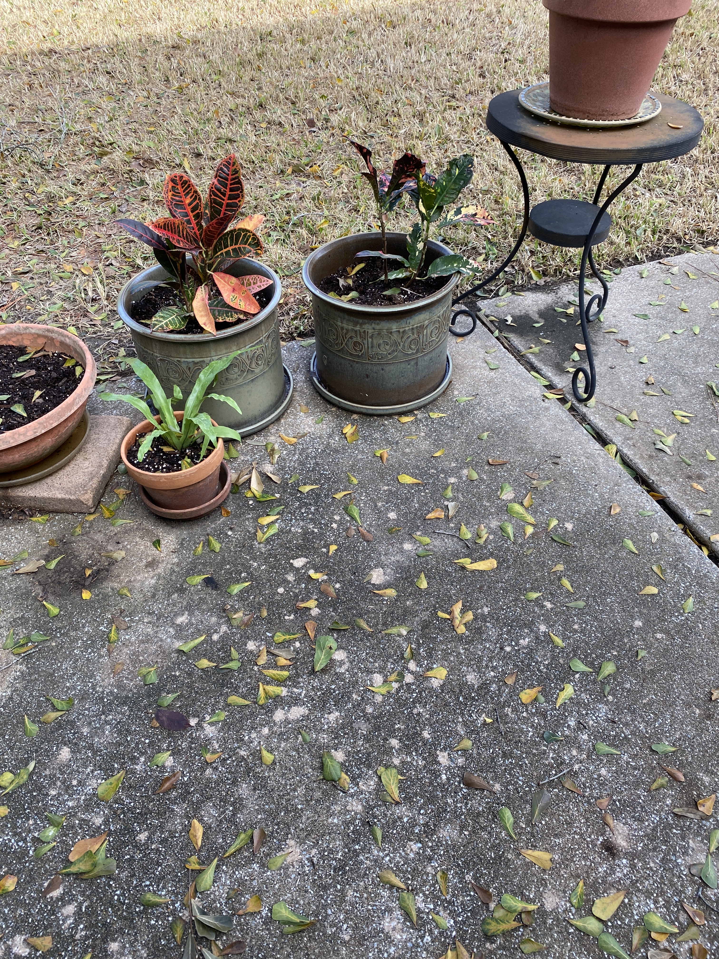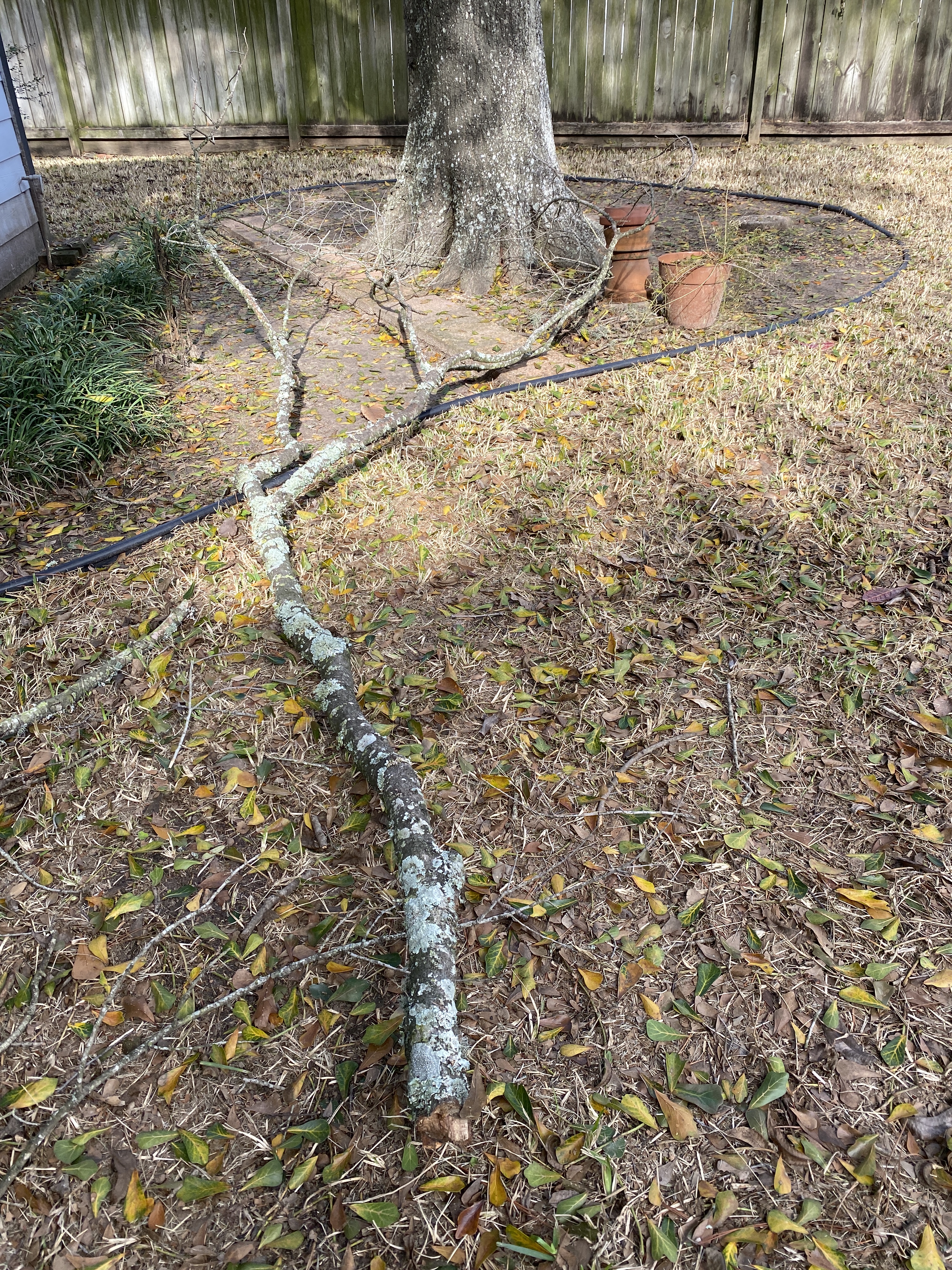 I pause on our patio where I’ve tried to create a spot of beauty, a place for us to retreat . . . .to simply be. Already nature is teaching me that the big beautiful trees in our backyard are messy. Not only are leaves constantly falling from the tall oak, but a large branch, too heavy for me alone to move, has fallen too.