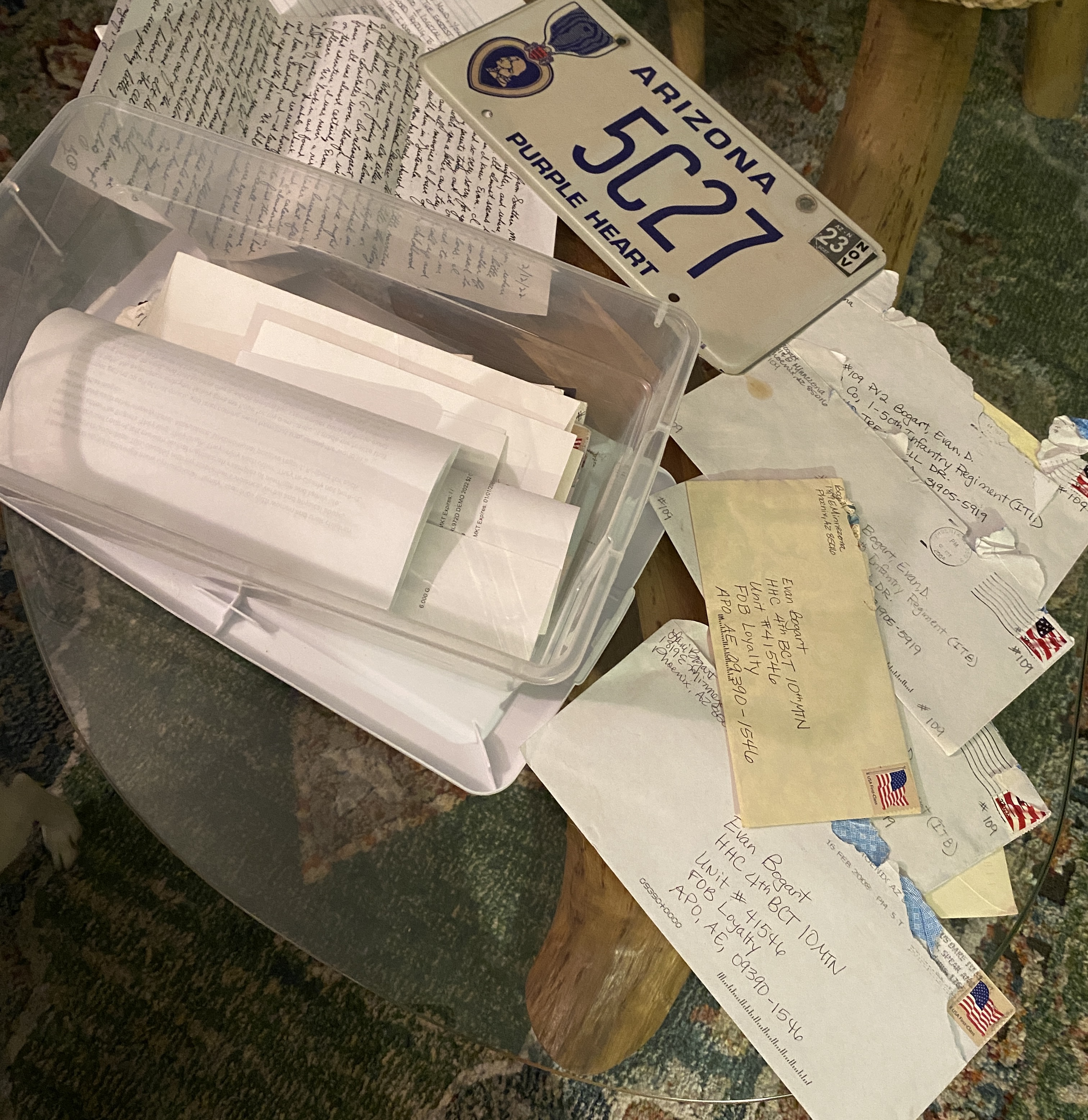 Arranging things in my closet, I find a box of letters. Atop the papers and envelopes is Evan’s Purple Heart license plate. I wonder vaguely if I ought to display it rather than hiding it away in my closet.