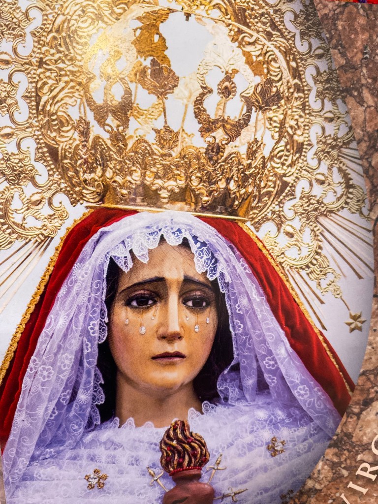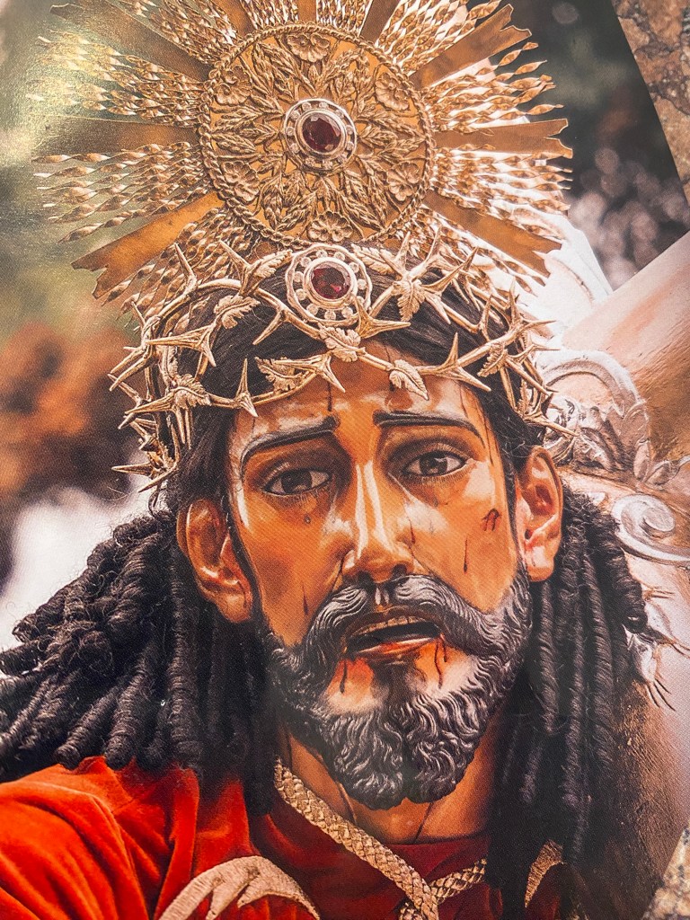 Drums and pipes, horns and bells ring out and the procession begins. The first Anda is carried by about 70 men. The strain of the weight they shoulder is visible on their faces. On the anda stands a statue of Jesus as a boy playfully holding a dove while St. Joseph works behind him at his carpenter’s bench. In the center is a much larger statue of a bloody Jesus crowned with thorns carrying his cross . Behind him, in a wooden chair, sits a smaller statue of Mary at a spinning wheel where she is turning wool into thread.