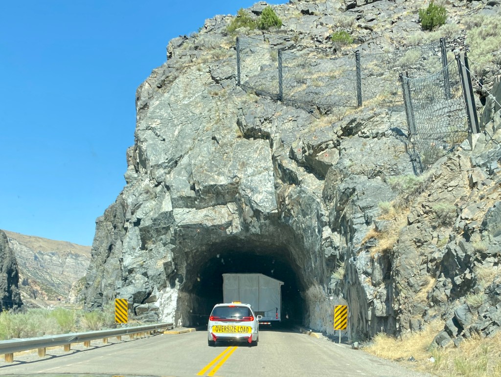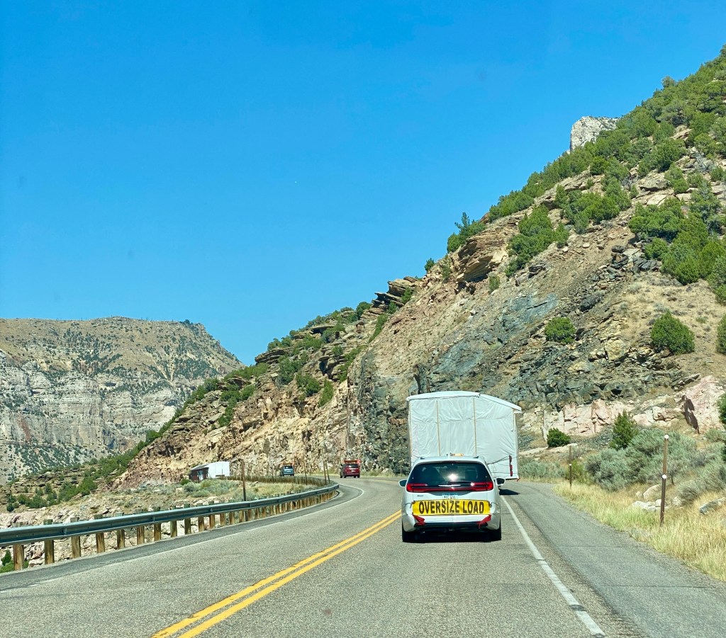 We get stuck behind two extra-wide-loads and three cars with flashing lights. Doug finally passes all five vehicles, but when we stop to see if we can (with the help of YouTube) figure out why our air conditioning isn’t cooling us anymore, the convoy sneaks past us again. We tail them on winding roads until we’re almost to Cody.