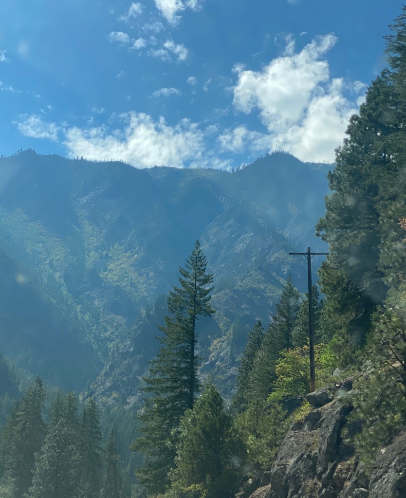 After driving through miles of recently harvested wheat fields we come upon forested terrain similar to what we’ve seen in earlier days of this trip, but denser, and on a grander scale. My eyes are constantly drawn to the heights where the sight of the mountains takes my breath away.