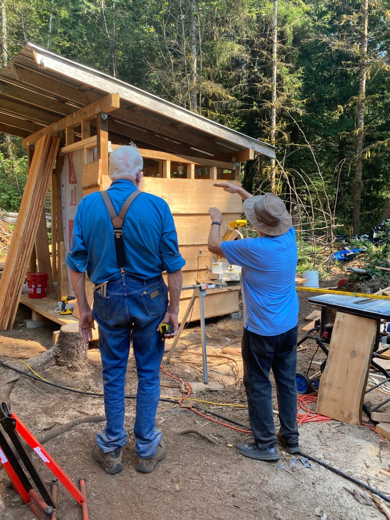 Doug and John (Caleb’s dad) are discussing the best way to apply fresh cut cedar lap siding to the outhouse.