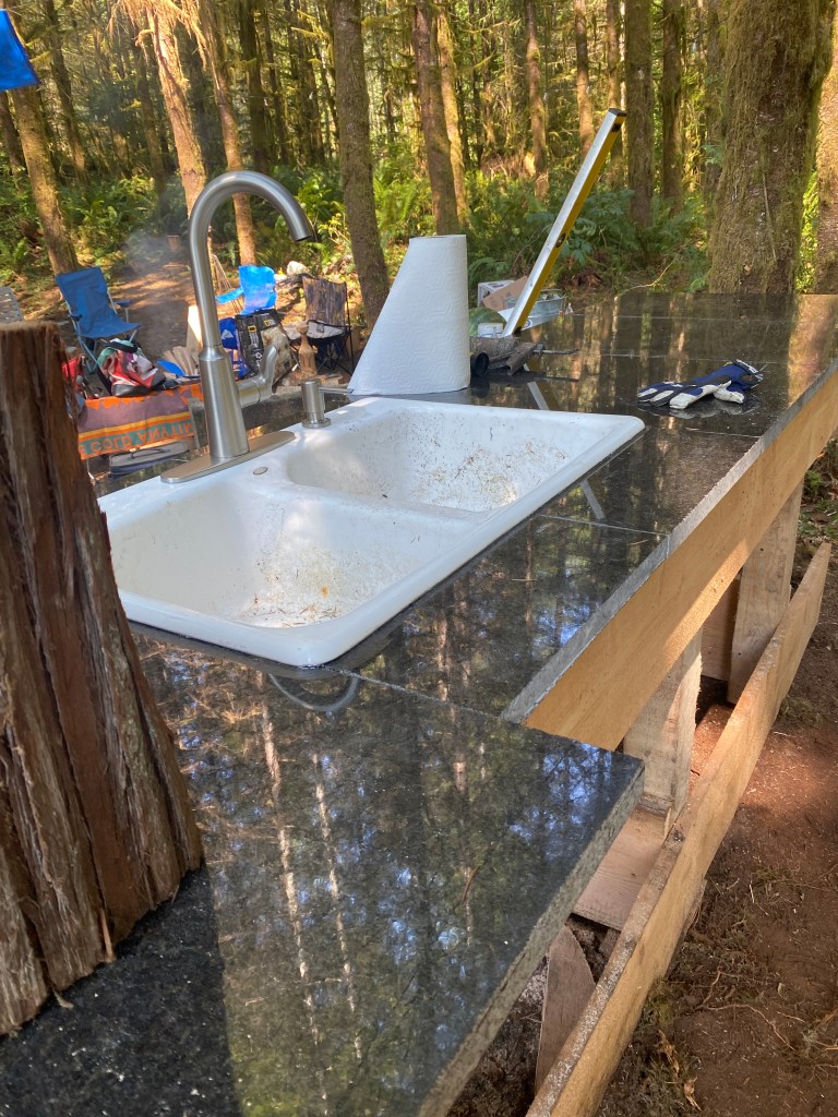 The sink is now firmly sealed into a granite countertop in the outdoor kitchen area.