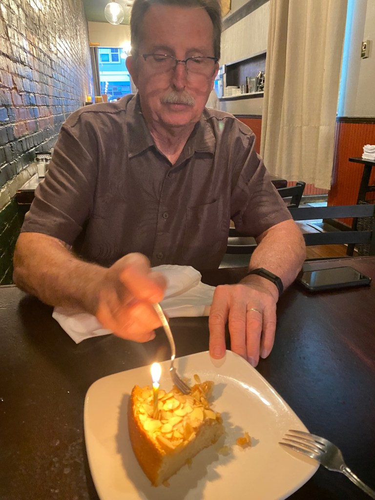 The food is scrumptious, so tummies full, we decline dessert. Nevertheless, our server sets a complimentary slice of almond torte on the table saying, “I know you said ‘no’, but ‘no’ means nothing to me.”