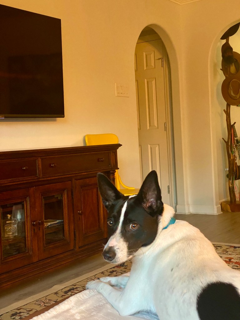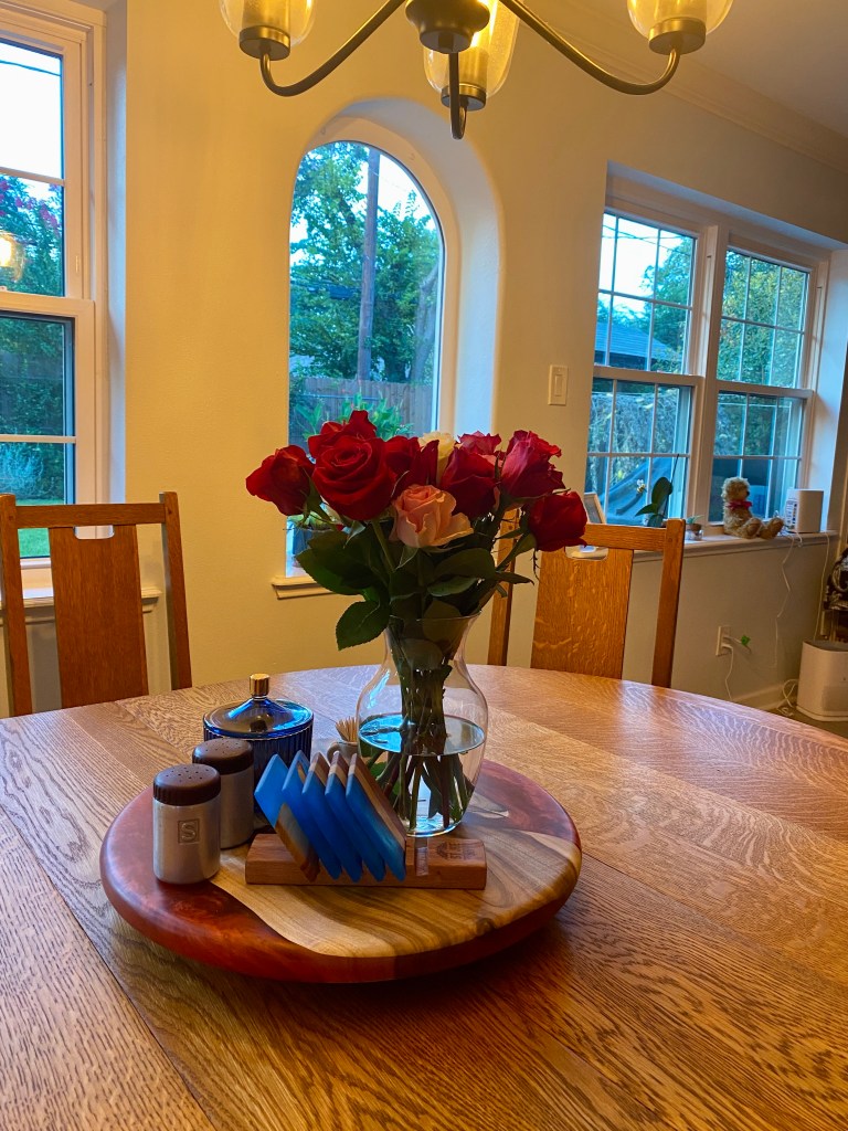 Below is my view from my favorite chair (including Doug, Xhiv, and Opal the dog). The other photos show the room where we pray, Harry the dog, welcome home roses on our table, and my African violets which thrived in my absence.