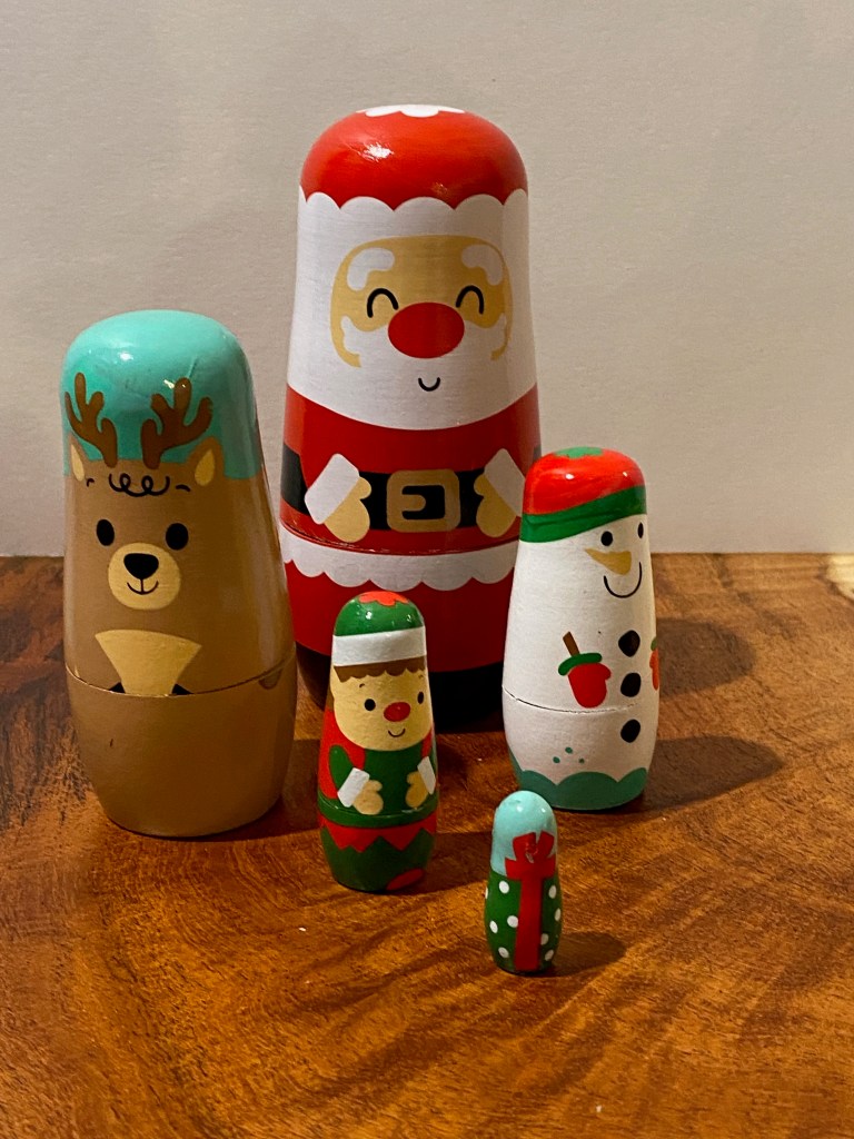 Tia Xhiv put out this new set as part of our Christmas decorations. It’s bigger and has not been taken apart and put back together repeatedly., The Santa is almost too big for Evan Marie’s hands. She asks for help to get it apart. Working with them renewed her interest in the Russian doll set. Today she had them all out and told us that they are her whole family.